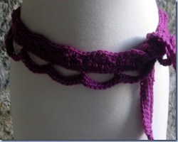 Crochet a belt of purple yarn. DK yarn is used with a 6 mm hook. It's easy to make if you use this free crochet belt pattern.