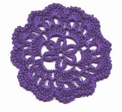 A steel hook and lace allow you to crochet this beautiful accent coaster. The purple color is sure to make heads turn and realize how great of a pattern this is. The flower in the middle is a great addition.