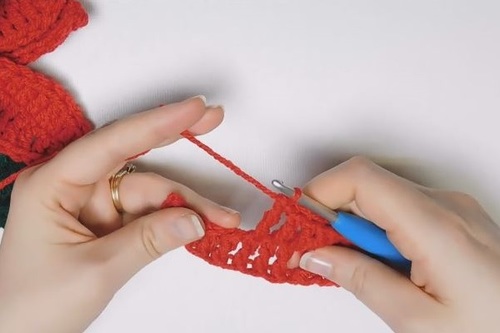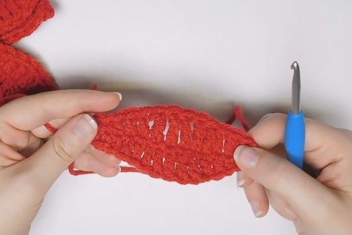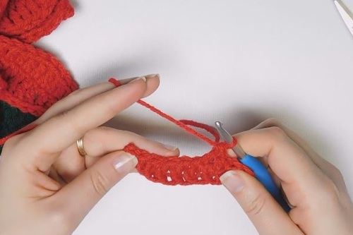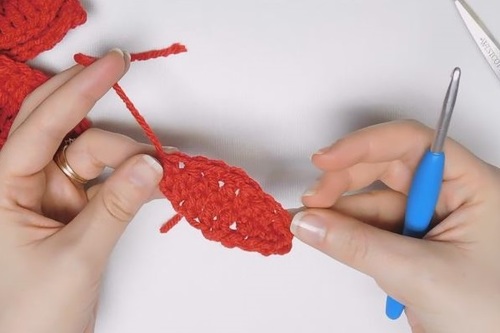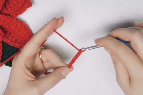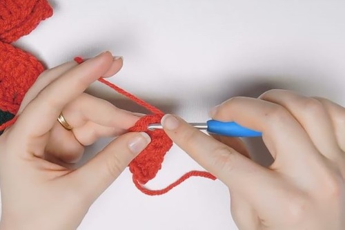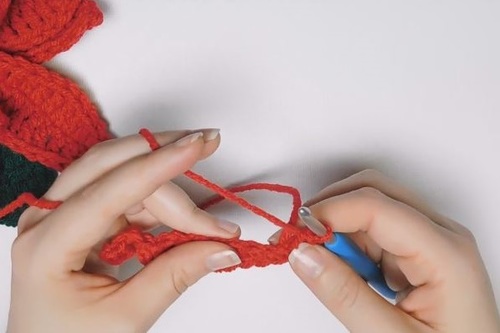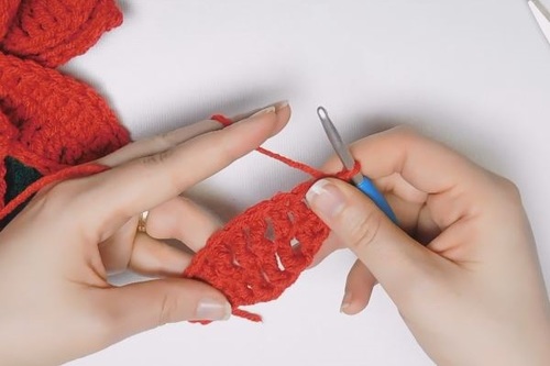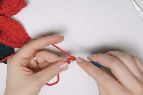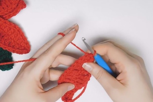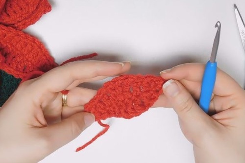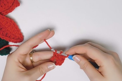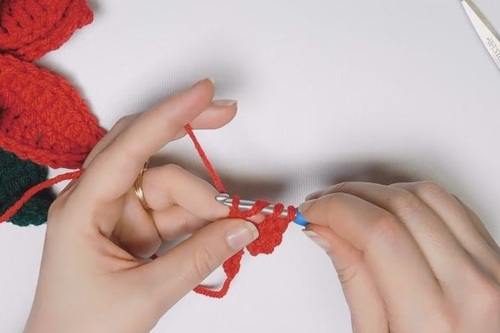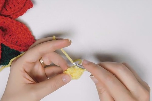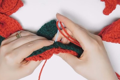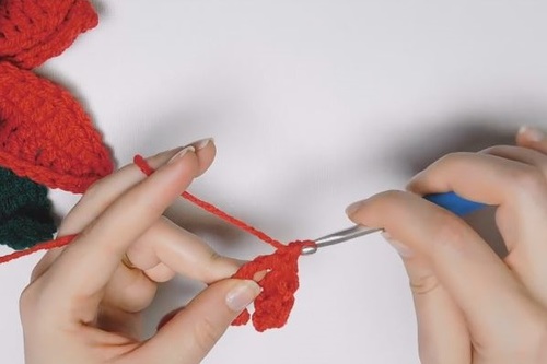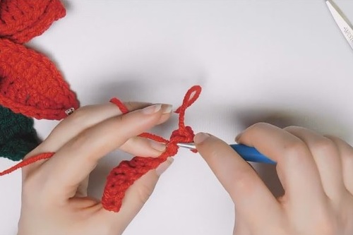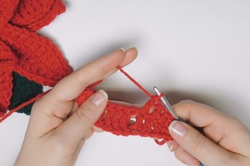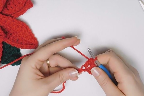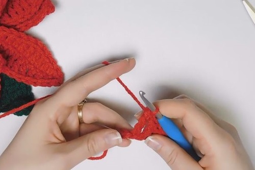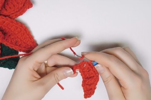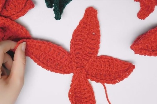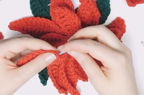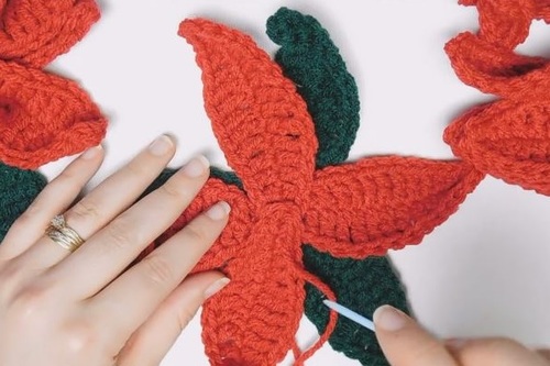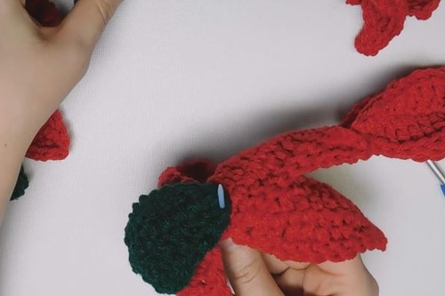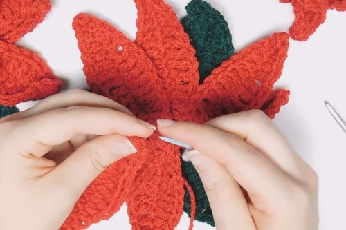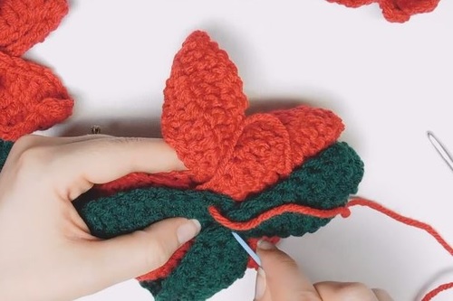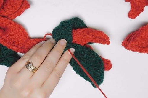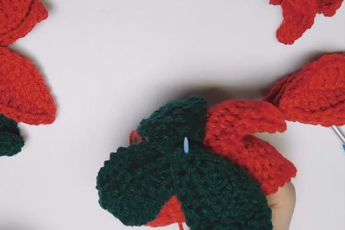 Place a green leaf underneath the red petals, ends matching up with the ends in the middle. Use the yarn needle to go through the middle of all the petals and the leaf.