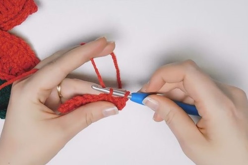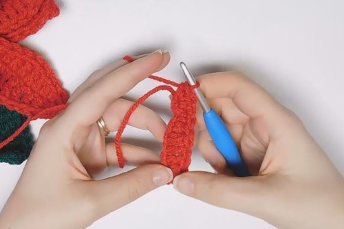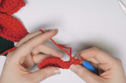 Repeat this process for the remaining seven large red petals and three green leaves.