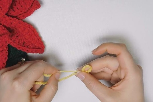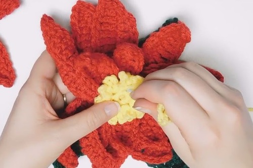 Place the yellow centerpiece on the middle of your poinsettia. Push the needle through one place on the center, down, and through the back of the flower.