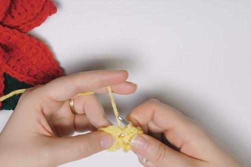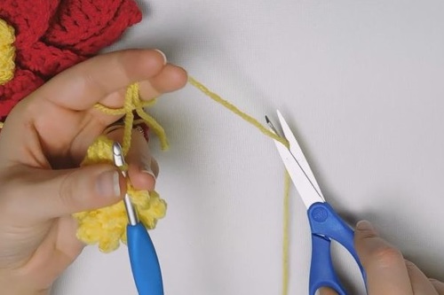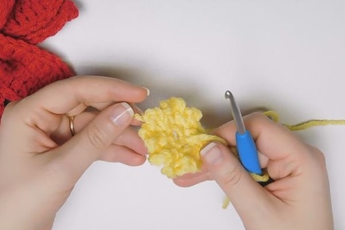 Change the color of your yarn in the needle to yellow using the tail from your center piece. -