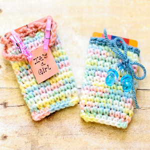 I love how the designer has worked these gift card holders to look like miniature baby blankets. The little charms really set them off, too. Since the holders are worked in Single Crochet, they would also make the perfect canvas for any other designs you might want to work over them. Personalizing them with the recipients monogram would add a very nice touch.