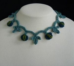The designer states that this necklace is based on a previous fleur de lis pattern. The new pattern is only accessible via download. The author also gives several suggestions about how to vary the look using beads or sequins (I would use plain roses with the fleur de lis), and also includes a link to earrings that match the original flowers.