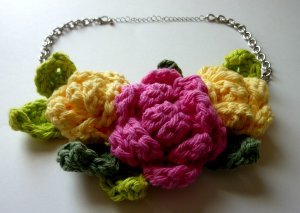 I can think of so, so many color combinations fit for this recycled rose necklace! The multicolored hues she chose in the original pattern are awesome. However, I am thinking of Michaels stores new Color Wheel yarns. You can choose a color like teal or fushcia and literally get every shade in that color! It would create a wonderful tonal effect!