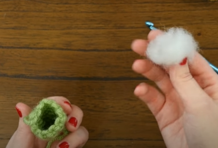 Stuff pouch with poly-fil. Using long tail from beginning of project, ch 1 and sc 5 across to close pouch. Break yarn and draw tail through. Weave in all ends to finish.