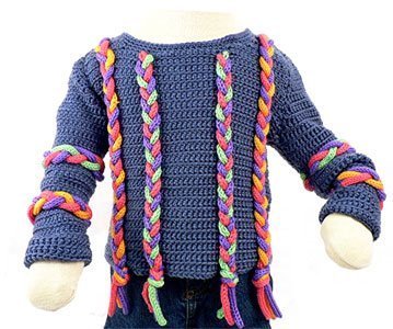This is a cute children's sweater. For me, I have not the time to crochet a sweater but I can make the braids and up-cycle an older sweater in the closet. I am thinking about starting small and applying a single stripe down the front and if it looks good, I may add more. Thanks for the idea.