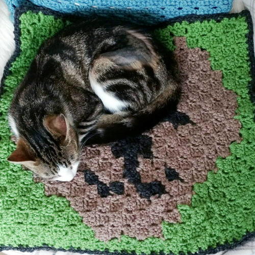 Make the blanket out of acrylic yarn so that it is easily washable and your cat can happily snooze away on it. The blog post includes a graph for the blanket and a link to a corner to corner tutorial."