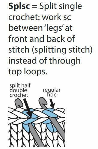 Splsc = Split single crochet: work sc between ‘legs’ at front and back of stitch (splitting stitch) instead of through top loops.