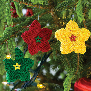 http//www.allfreecrochet.com/Crocheted-Christmas-O == rnaments/Bright-Star-Ornament I love how cheerful these stars are on my tree. I have a number of stitched patchwork ornaments, and I crocheted a batch of the stars in matching colors. I had a bit of trouble finding the star buttons, but finally located some at a craft store in a larger city. I bought several small bags so I can make the stars to attach to my baked goodies. That way the neighbors get two gifts in one!