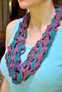 The Out of this World Lattice Cowl is an open, airy, light cowl that is more like a chunky necklace than a cowl and is perfect for warmer weather. This crocheted cowl uses the crochet clover lattice stitch, but I modified it quite a bit to crochet it in the round. The clover part is just darling. It might look complicated, but I got the hang of it after about 4 rows.
