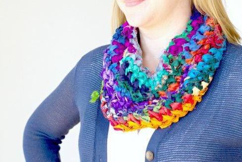 The Simple Ribbon Crochet Cowl is an easy crochet pattern to make using Reclaimed Sari Ribbon yarn. This particular reclaimed yarn is available in a variety of fun colors, but the colorway shown here is called "At the Bahamas." All you need is two skeins of yarn to work up this colorful crocheted scarf, and a jumbo crochet hook (size N or larger). This pretty cowl is a great way to keep your neck warm while also added a quick pop of color to your outfit.