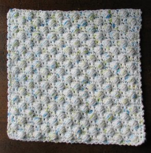 I have always known this stitch as the popcorn stitch. It is a VERY fun stitch to do. I haven't used this stitch since I made my son a baby blanket 15 years ago. Oh- the bobble stitch is another name for it. It will really facilitate the cleaning process, whether it be the bath, your dishes, or your dirty coffee table. It is very pretty done up in those light pastel colors.
