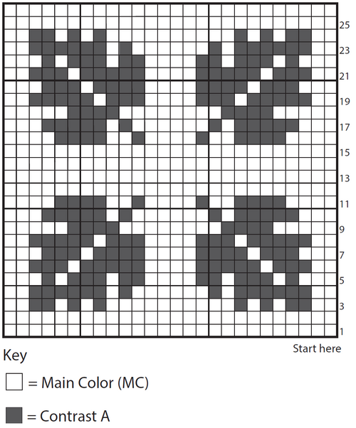 With MC, ch 27. Work Chart, noting each square of chart is equal to 1 sc and reading RS rows from right to left and WS rows from left to right. Carry color not in use across top of entire previous row and work sts around it. This will ensure even gauge as all sts will be worked around an extra strand of yarn held across top of previous row. Carry both colors up side of work.