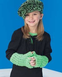 A perfect outfit for your child is this kids chunky newsboy cap and fingerless gloves. It's a matching set that look great together and you can change the colors if you wish. This pattern is shown in Bernat Softee Chunky.