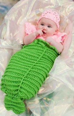 Use this crochet baby cocoon pattern to make an adorable Mermaid Cocoon for your little one. This is a creative project that will keep your baby bundled and comfortable. Sizes are three to 12 months. Take some fun family photos!