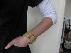This cool wrist cuff is crocheted using a sportweight linen blend yarn. Its neutral color allows you to wear it with any outfit. This fits small to medium sized wrists.