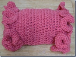 This ruffle hand warmer is a great design. If you don't want to wear gloves you can just stick your hands in this hand warmer. The handmuff itself is worked in a continuous round.