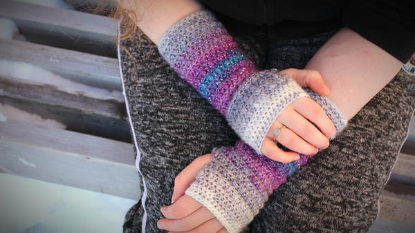 "This crochet pattern uses a modified beginner stitch making it a great option for beginners looking to step out of their comfort zones. This project can easily be made in a single night. You can also make multiple pairs of fingerless gloves with a single 100g ball of yarn. This project works the best with weight 3 self-striping or variegated yarns. The modified stitch makes a great textured pattern that is super simple to form once again making it great for beginners. "