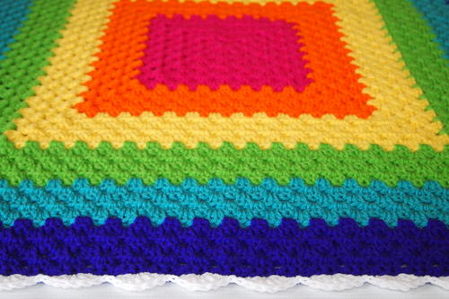 Once you've mastered the crochet stitch pattern of this rainbowlicious design, simply keep repeating it, around and around the blanket. Keep the bright and vivid color scheme as in the photo, or you can switch things up with your own favorite color or colors. Though we love the look of this rainbow granny, it would be beautiful in ombre blues, reds, or greens, too!