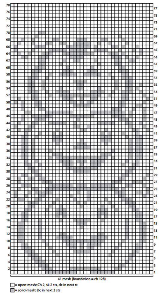 2. Each filled box on the chart represents one solid-mesh and each empty box on the chart represents one open-mesh (see Special Stitches). Read right side rows of chart from right to left and wrong side rows from left to right.