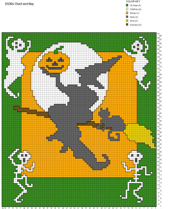 Repeat around remaining edges of the orange center section, skipping the areas where the broom handle, broom end, ghosts, moon and skeletons overlap the orange.
