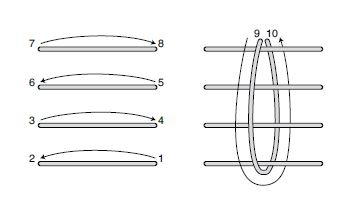 Using C and yarn needle, secure on the wrong side and bring needle up at 1. Following diagram, make 4 parallel stitches for legs ending with yarn on wrong side. Bring needle to right side at 9 and over the top of the legs, pass needle under legs and down at 10. Pull yarn carefully to splay legs. Fasten off on wrong side.