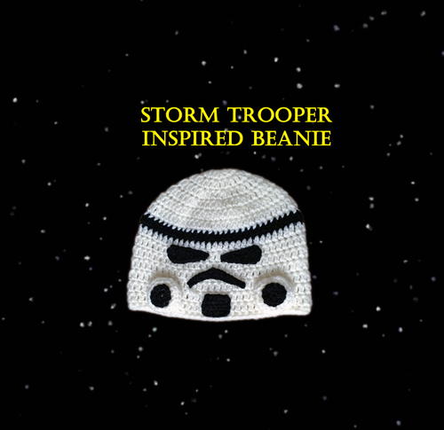"Star Wars storm trooper inspired beanie. Perfect pattern for any Star Wars fan. The pattern includes written instructions for adult, child and toddler sized beanies. This project is quick and easy to crochet. You will need worsted weight yarn in white and black, size F,H and I crochet hooks and a needle."