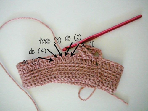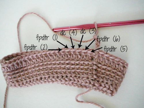 Skip 4 st, fpdtr around next 2 st, dc in third and fourth skipped stitch (behind the two fpdtr’s just created), fpdtr around the first and second skipped stitch in front of all 4 stitches just created.