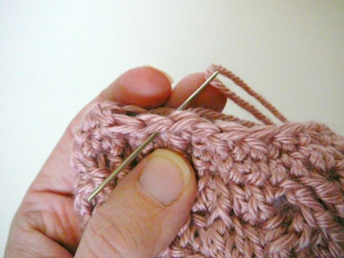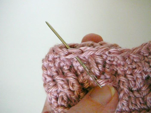 Using yarn needle, weave tail through the tops of each sc alternating front to back and back to front. -