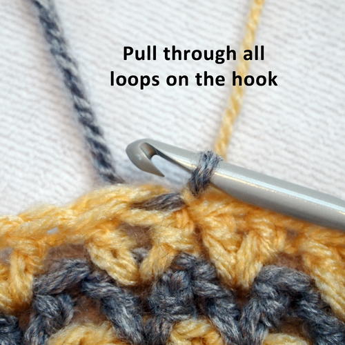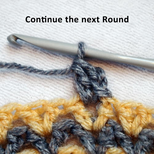If you are not comfortable carrying your working yarn between Rounds, you can fasten off after each Zigzag Round and join your new color between the starting chain and the post of the first DC.