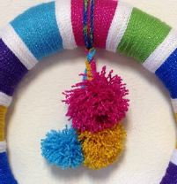 Make a 2” 5.1 cm) pom-pom with B. Attach to the wreath hanger so pom-poms hang in the center of the wreath.