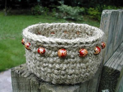 I have quite an extensive collection of baskets so this project really caught my eye. I garden, so I already have spools of jute lying around. This is a very basic pattern, and I love how the beads are applied after the basket itself is finished. Since it is so basic, its easy to adjust the diameter as well as the height to suit your own purposes.