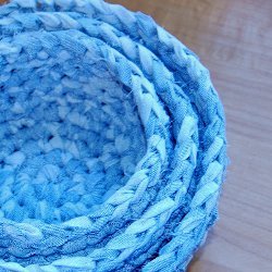 Nesting baskets are always a handy thing to have around. I use them for everything from storage to holding the yarn I am using for the most recent project I am finishing up. This design uses fabric yarn. I am thinking that they may keep their shape better than if they were made with typical yarn types. It also gives them a more retro look.