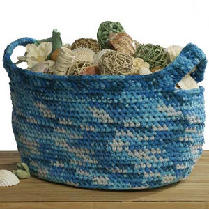 This basket is the perfect project for beginners. It works up very quickly and the result is a very sturdy and very versatile basket. The colour scheme is just perfect for a beach bag too or to hold soaps and creams and other pamper gooodies in an ocean themed bathroom.