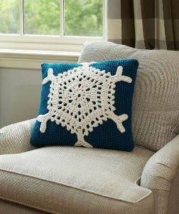 I love this project but instead of working up the pillow itself in crochet, Im going to use navy fleece to cover some pillows I already have. Since my living room dcor already involves various shades of blue, this will work out just fine. After all, the most important part of this project is the snowflake, not necessarily the pillow. The designers tip to mist and block the flake before attaching to the pillow is spot on, too.