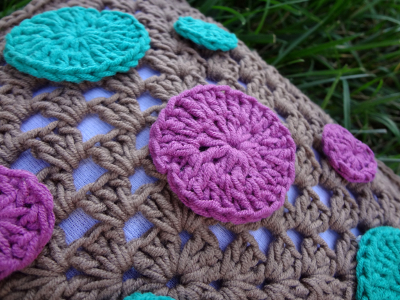 Attach dots to granny squares by seaming them on with a tapestry needle and a length of same colored yarn. Or if you prefer, you can attach the dots to the pillow with some fabric glue instead.