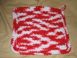 This is a nice simple potholder, and the designer give it extra interest by alternating working the Single Crochet stitches into the Front and Back Loops Only. That gives what would be a very ordinary, uninteresting project a bit of interest. She also jazzes things up by using a variegated yarn. If you want to use a solid color to match a particular dcor, you could still use a contrasting yarn for the border.