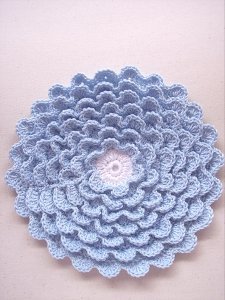 This reminds me so much of a favorite flower pattern of minethe Everlasting Zinnia. The designer links to the original project, but I was having a lot of trouble trying to save my download. It does look just like the Zinnia, but instead of a crocheted backing circle, the original and current designers use fabric with a layer of heat resistant fabric between crocheted portion and the patterned fabric.