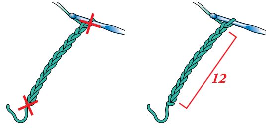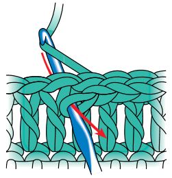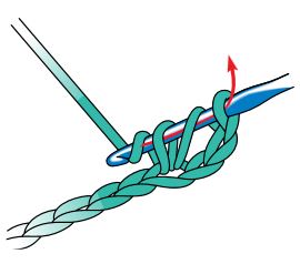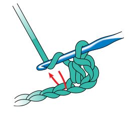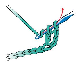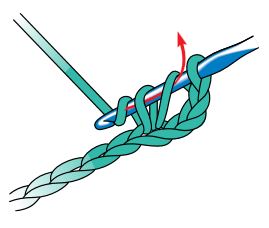 Repeat to form the number of chains specified in the instructions. Do not count the slip knot as a stitch. When working into the starting chain, you may work under one or two strands of chain loops as shown in the illustration. Either of these methods forms an even, firm bottom edge. Some people like to work into the “bump” on the back of the chain. This forms an even, stretchy bottom edge that is ideal for garments. Whichever method of working into the foundation you choose, be consistent. Work all the pieces of a project in the same manner.