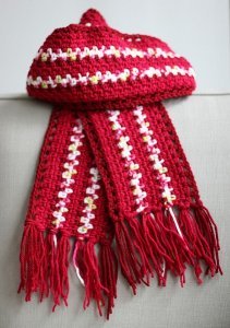 This would be just so cute for a little boy! You could add some train appliqus near the ends, or if you change the color of the scarf, add little cars instead. For a childs scarf, I would eliminate the fringe on the ends though. There is no pattern on the sitebe aware that you will need to click on an additional link to access the pattern this project is based on.