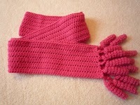 Fringe: Holding 2 strands of yarn together. Chain 25, 3 sc in every chain. Fasten off, leave about six inches of yarn to fasten to scarf. Make 12 curly Q's, Fasten 6 to each end of the scarf. Viola!