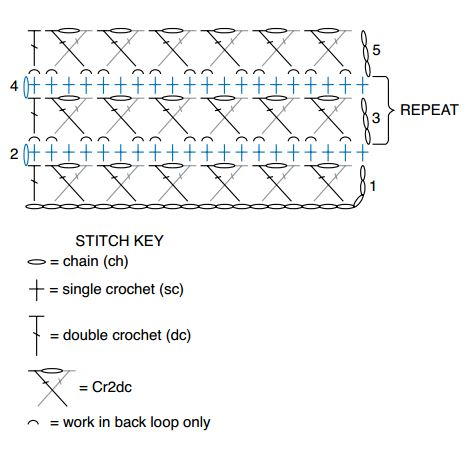 3rd row: Ch 3 (counts as dc). (Working in back loops only, Cr2dc over next 3 sc) 6 times. 1 dc in last sc. Turn.