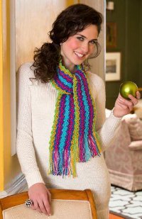 I was hoping this scarf was still at the Red Heart web page so I could score a free download, but it doesnt appear to be at the site anymore. This is one case where the scarf NEEDS to be worked lengthwise because of the constant color changes. You work the exact same V Stitchyou just change colors for each row. No worries about weaving in ends either since they can be incorporated into the fringe.