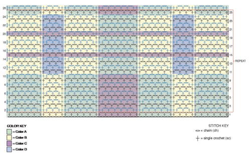 I agree that Tartan projects can be very challenging. If you are serious about making this stunning scarf, I would highly recommend going to the Yarnspirations site and downloading the pattern directly. There arent any more photos than are posted with this article, but the stitch chart is much larger and can be enlarged further in Adobe. Theres also a small detailed sketch of the fringe as well.
