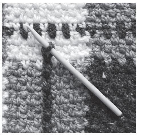 12th row: With B, ch 1. 1 sc in first sc. (1 sc in next ch-1 sp. Ch 1. Skip next sc) 4 times. 1 sc in next ch-1 sp. 1 sc in next sc, joining D in last sc. *With D, 1 sc in next sc. (1 sc in next ch-1 sp. Ch 1. Skip next sc) twice. 1 sc in next ch-1 sp. 1 sc in next sc, joining B in last sc. With B, 1 sc in next sc. (1 sc in next ch-1 sp. Ch 1. Skip next sc) 4 times. 1 sc in next ch-1 sp. 1 sc in next sc, joining A in last sc.* With A, 1 sc in next sc. (1 sc in next ch-1 sp. Ch 1. Skip next sc) 5 times. 1 sc in next ch-1 sp. 1 sc in next sc, joining B in last sc. With B, 1 sc in next sc. (1 sc in next ch-1 sp. Ch 1. Skip next sc) 4 times. 1 sc in next ch-1 sp. 1 sc in next sc, joining D in last sc. Rep