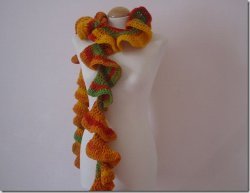 This is a really cute scarf. I am not really fond of the color selection. It puts me in the mind of a clowns collar. I would think something in a solid color would work best for me. It is a shame that the pictures on the directions page do not show. It could be because the post was from 2009.