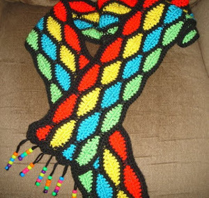 What a nice backstory behind the inspiration for this creative scarf. I like projects that have a personal story to them. It somehow makes the item even that much more desirable. Gotta have those bright colors...for me, anyway! Not a fan of the beading on the fringe, though.