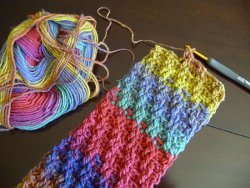 You can always count on the Crochet Crowd to come up with some novel ways to use the same old stitches. The actual pattern is quite short because once you establish your initial row, you work Rows 2 through 5 over and over until you get the scarf the length that you want. I do like the rainbow effect of the yarn, but if you really want to show off the texture of the stitches, opt for a darker solid like olive or burgundy.
