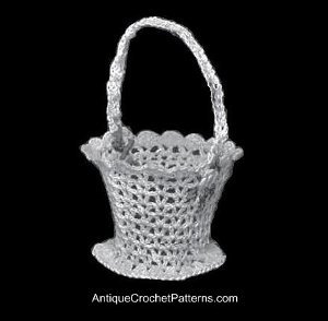 Make an antique-inspired crochet basket with this free crochet pattern. Stiffen the basket once it's made to give it a more sturdy look. This intermediate crochet pattern is ideal for flower girls to use at weddings, or kids to use at Easter to carry their candy. White crochet thread is used to complete this basket. Handles make it easy for kids of all ages to carry. The look of this basket can be personalized a bit by adding an applique such as a flower or butterfly.